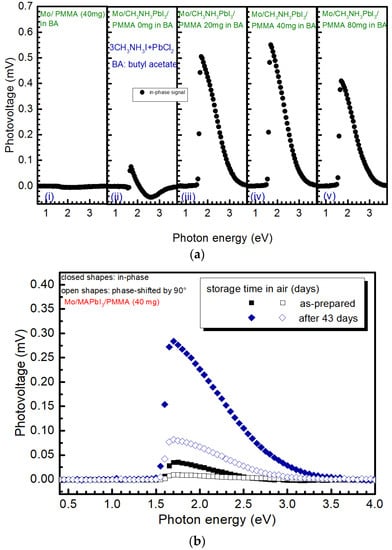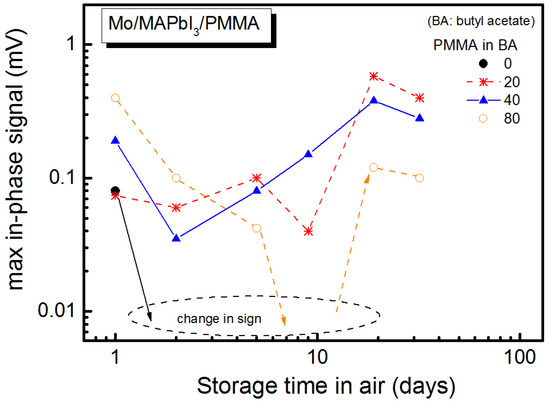 Figure 6 shows maximum in-phase SPV signals on a logarithmic scale when the samples were stored in air for 43 days. Perovskite coated with 0 mg/mL of PMMA, a change of sign after the first day of storage in air was observed and an impurity phase of PbI