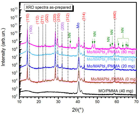 3 deposited onto the Mo substrate and thereafter coated with PMMA at concentrations of 0, 20, 40 and 80 mg/mL for the as-deposited sample measured on the day of preparation. Not all samples showed PbI