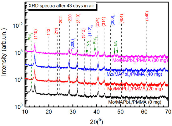 25]. Perovskite coated with 40 mg/mL of PMMA did not show any impurity phase even after storage in air for 43 days. This indicates that 40 mg/mL of PMMA can be the optimum concentration for it to act as a blocking layer. However, for 80 mg/mL PMMA, small impurity phases at 12.67° and 39.50° were observed together with the coexistence of two phases.