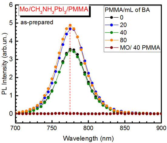 Figure 5 shows PL spectra for perovskite coated with 0, 20, 40, and 80 mg/mL of PMMA and for 40 mg/mL PMMA on Mo substrate. The maximum emission was observed at the same wavelength of 775 nm for all perovskite samples. This was consistent with the data reported elsewhere [