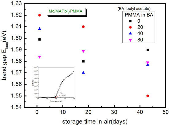 Etauc decreased monotonously with increasing storage time in air except for 80 mg/mL of PMMA, which showed a slight increase in band gap from 1.584 eV on first day to 1.589 eV on the 18th day of storage in air, before decreasing to 1.587 eV on the 43rd day of storage in air. The 20 mg/mL PMMA showed a wide band gap of more than 1.6 eV as compared to other samples during the first 18 days and smallest band gap of 1.55 eV after 43 days in air. Previous reports indicate that the band gap increases with the decrease in concentration [