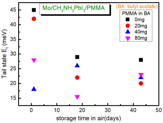 3/PMMA as a function of storage time in air. During the first day, the 0 mg/mL sample recorded the highest tail states of 45 meV. This might be attributed to intrusion of moisture related impurities into the film due to absence of PMMA that acts as a protective layer. Moreover, 20 mg/mL had a tail state of 42.5 meV which was still quite high as compared to 80 mg/mL with 26 meV. The 40 mg/mL sample had the least amount of tail states of about 18 meV which is comparable to an Urbach tail energy of 15 meV obtained by De Wolf et al. [