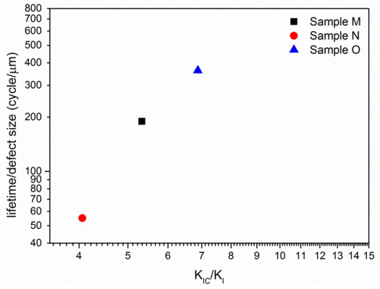 | Sample | Strain | Defect Size (μm) | Average Elastic Modulus (GPa) | Average Fracture Toughness (MPa·m1/2) | Lifetime (Cycles) | Lifetime/Pore Size (Cycles/μm) | |