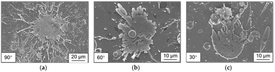 In this study, different shapes of flattened splats were observed by means of electron microscopy for particles deposited using a spray angle of 60° and 30° (Figure 5). Since the spray angle was reduced to 30°, the spray particles are more likely to possess an elongation of flattened splats. For single splats, it was found that the impinging splats slide over the surface and partially disintegrate.