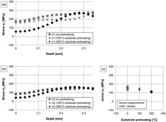 As obtained from the BHDM, tensile stresses were determined with a gradient towards lower values at the surface (Figure 6a,b). In this respect, the stresses increase along the coating thickness, reaching a maximum next to the coating/substrate interface. This tendency is noticed for all sample types: the preheated (150 °C and 300 °C) and untreated (no preheating) sample types. With respect to the mean average for the in-plane stresses σ1 and σ2, the deposit produced with the use of a substrate preheating temperature of 300 °C exhibits the lowest tensile residual stress state, followed by the deposit produced with a substrate preheating temperature of 150 °C and the sample where no preheating is applied. As observed with the curvature method, the variations of the substrate preheating temperature (no preheating, 150 °C and 300 °C) lead to similar stress states. It is observed that a substrate preheating temperature of 300 °C brings about the lowest stress field in the coating, which was calculated between 106–116 MPa for different specimens (Figure 6c). The calculated stress field in the coating for a substrate preheating temperature of 150 °C is 131–147 MPa towards tensile, compared to 133–168 MPa for specimens deposited without a preheating procedure.