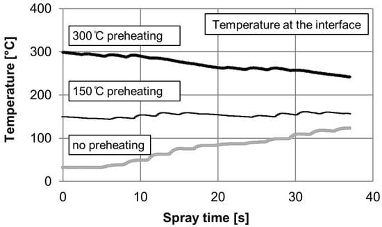 Figure 7. Evolution of the temperature at the interface during spraying depending on the substrate preheating temperature.