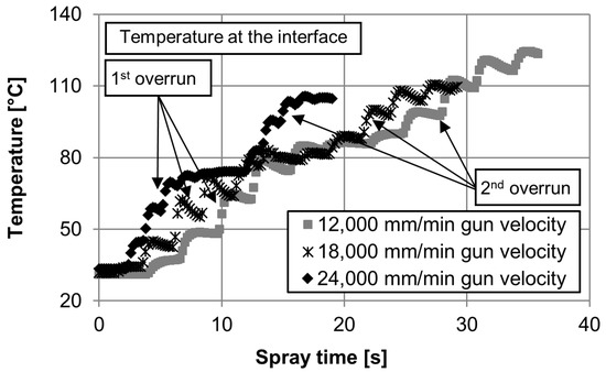 Experiments that monitored the temperature next to the surface of the substrate during spraying for different velocities showed that for a lower gun velocity, a slightly higher surface temperature occurs after each overrun as well as during spraying (Figure 9).