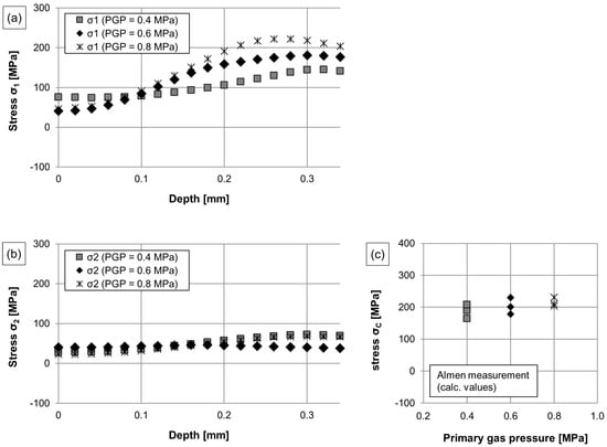 Figure 10. Residual stress distribution along coatings produced with different PGP, determined by using the bore hole drilling strain gage method (a,b), and calculated stress states in coatings produced with different PGP using the curvature method (c).