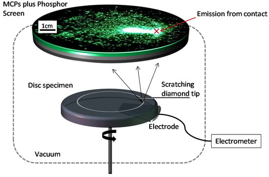 The tribometer used to conduct the study is represented schematically in Figure 1 [17,22]. It consists of a system of microchannel plates (MCPs, i.e., arrays of electrons multipliers), coupled with a phosphor screen (Photonis Inc., Sturbridge, MA, USA). The two circular MCPs, in a chevron arrangement with an active diameter of 75 mm, are located 10 mm above and parallel to the disc specimen (note: the centre of the circular MCPs are located directly above the centre of rotation of the disc). This setup allows us to obtain spatially resolved images of the triboemission, with 1:30 magnification due by the divergence of emitted electrons. The emissions detected and visualised through this system were recorded by a high speed camera (Phantom Miro eX, Vision Research Ltd., Bedford, UK) with a Fujian 35 mm f1.7 lens located above the experimental setup. The sliding contact was produced by loading a diamond tip of radius 100 μm (Synton-MDP Ltd., Port, Switzerland) against the rotating disc specimen. The rotation of the disc was recorded by the supplied PCS Instruments encoder device. In addition, an electrometer (Model: 6517b, Keithley Instruments Ltd., Bracknell, UK) coupled with a 10 mm × 5 mm metal sheet electrode attached underneath the specimen was used to inductively measure the charge of the surface, simultaneously with the emission detection. The tests were conducted in vacuum conditions at a pressure of ~10−5 Torr.