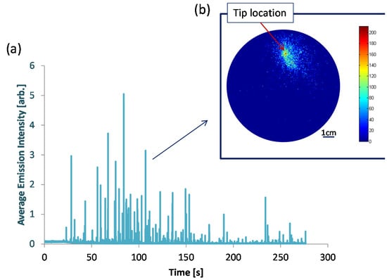 (a) Average Emission Intensity (spatial average of each phosphor screen image) vs. time, (complete test); (b) Phosphor screen intensity of a single emission event.