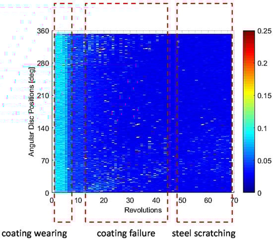 An alternative way to display the same phosphor screen intensity data is to plot the average emission intensity as a function of the cycles and the angular disc position of the stylus relative to the disc, as shown in Figure 3 (with each coloured square representing the average phosphor screen intensity). Here, the spatial evolution of the emissions can be visualised and divided into three regions. Initially, there is a moderate level of emission indicated by the pale blue rectangular section at the start of the test. Towards the end of this period, the first and highest intensity peak in emission occurs, and the low-level baseline emission transitions into the second stage of the test (shown by the background colour becoming dark blue). From this point onwards, sporadic high intensity peaks occur, although their intensity is lower than that of the first event. Eventually, the frequency and magnitude of these peaks reduce, as shown by the mostly uninterrupted dark blue region.