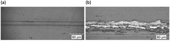 It is hypothesised that this observed behaviour is attributed to the following mechanism. The initial area characterised by a constant, low level intensity (the light blue colour) defines the emission generated by the wearing of the non-conductive coating layer as shown by the optical microscopy scan in Figure 4a. This is in accordance with previous studies on non-conductive materials [17]. The following high intensity emission event indicates the moment at which the coating fails resulting in a wear trace characterised by both surface cracks and partial delamination (Figure 4b). This is in accordance with previous studies that suggest that emission is due to the high energy generated during the damage of the surface, in particular crack formation [17,19,31,32]. The third region shows relatively few high emission events, occurring due to wearing of the remaining coating. The baseline emission (shown by the dark blue colour) is at a low level due to the scratching of the metal substrate, which can conduct away charge and hence prevents emission. This is in agreement with the fact that the triboemission intensity is greater for materials with high electrical resistivity [33].