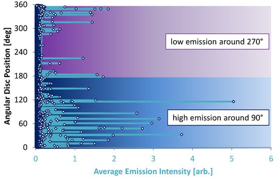 Since the angular position of the disc is recorded and synchronised with the camera acquisition, the average emission intensity can be plotted as a function of the angular position of the disc as shown in Figure 5. Here, it is evident that the highest intensity emissions are localised around 90° and the lowest intensity emission are around 270° of disc rotation. Visual inspection of the disc revealed that the depth of wear around the track was not uniform. It was therefore hypothesized that the area of the disc characterised by high intensity emission events corresponded to the diamond tip contacting the non-conductive coating. Conversely, the area characterised by low emission events corresponded with the tip scratching the conductive steel.
