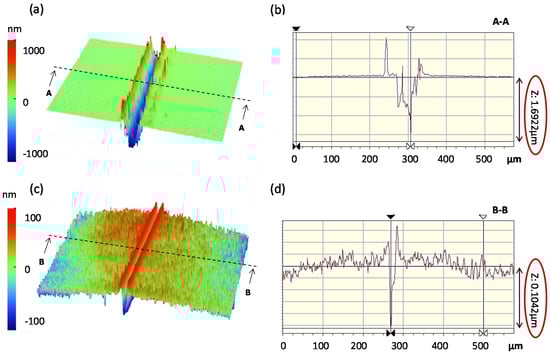 After the test, a Veeco optical profilometer analysis of the surface was conducted to evaluate the depth of the wear track in the two areas under consideration. Results are shown in Figure 6. It can be seen that the wear track at the angular position of 270° is 1.69 μm, which is deeper than the thickness of the coating layer (Figure 6b). In the region of the disc surface around the 90° location, the depth is only 0.1042 μm, which is less than the thickness of the coating layer, as shown in Figure 6d. This proves that, around the 90° location, the coating was not removed so that the tip scratched the coating generating an emission in accordance with triboemission measurements for non-conductive materials. However, around 270°, the tip scratched the metal substrate and the intensity of the emission was reduced in accordance with previous emission measurements for conductive materials.