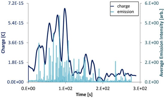 The release of the emission was then compared with the evolution of the charge on the disc surface. To do this, instantaneous measurements of charge on the surface and the average of the emission intensity are plotted as a function of time in Figure 7. There is a clear correspondence between the emission intensity and the charge accumulation for the DLC surface (a local regression smoothing method was applied to the charge measurement data for a better comparison). In the first part of the test, there is a clear correspondence between the negative emission peaks and the positive charge peaks. This suggests that the surface charges positively, at least partly due to electrons leaving the surface. At around 100 s, the reduction of the emission intensity and the charge can be attributed to the failure of the coating. It is suggested that this reduction is caused by: (i) the scratching of a reduced area of coating (part of the coating is removed during the first 100 s of the test); (ii) the exposure of the metal substrate which switches the contact from being diamond/DLC to being diamond/steel, preventing the accumulation of opposite charge on each of the two counter bodies which would otherwise lead to emission; and (iii) the exposure of the steel substrate which may absorb charge, preventing the generation of emission.