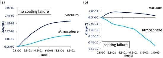 Surface charge vs time in vacuum and atmosphere: (a) no coating failure—cumulative; (b) coating failure—cumulative.