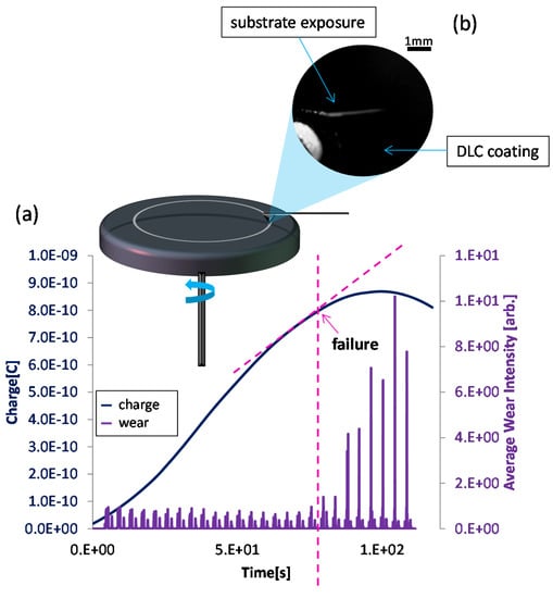 In this paper, we propose a new in situ and real-time technique to monitor the failure of diamond-like-carbon coating on a steel substrate during sliding tests under vacuum and atmospheric conditions. The method combines triboemission imaging and tribocharging measurements. Triboemission refers to the emission of charged particles such as electrons, protons, positive ions and negative ions that occur during surface damage (i.e., cracking formation, wear) [17,18,19,20]—see the supplementary example video showing imaging of continuous electron emission arising from a moving alumina specimen scratched by a stationary diamond tip. These emissions correlate positively with the electrical resistivity of the rubbed material, which decreases from insulators to conductors (in the order: insulating > semi-conductive > conductive) [17,21]. Furthermore, our recent studies on the spatial characteristics of triboemission bursts have shown that their direction, shape, size and intensity depend on the failure mode of the materials (such as cracking and grain pull-out) [17,22]. Tribocharging measurements, on the other hand, are used to monitor the variation of the charge on the surface, which may be related to tribochemical reactions occurring at the surface contact area [23,24].