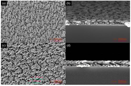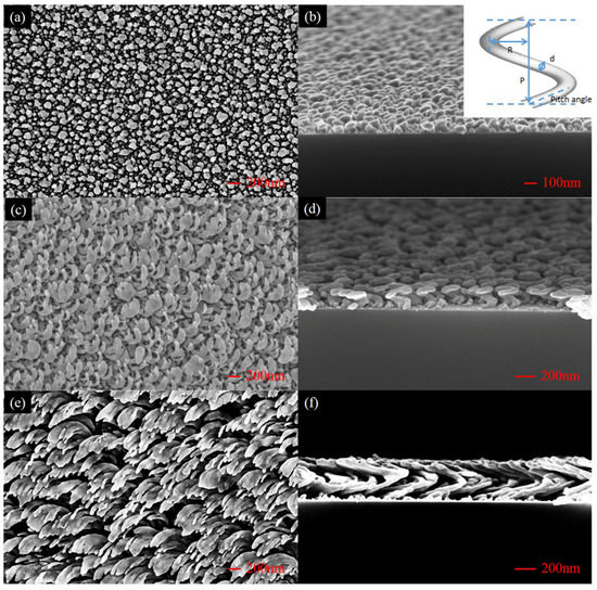 Owing to the development of coatings, nanohelices with feature sizes of less than 100 nm can be produced using a cheap and easy method called glancing angle deposition (GLAD). The GLAD technique is a unique technique for wafer-scale deposition via a one-step process [3,4]. In 2013, Mark et al. [5] employed an extremely low substrate temperature of approximately −140 °C to obliquely deposit gold nanohelices with pitch lengths of only 34 nm on a seeded surface. The low substrate temperature was required to reduce the diffusion energy of deposited atoms, and the seeds on the surface were arranged to offer a shadowing effect [6]. However, expensive lithography is required to pattern the seeded surface of the substrate [7]. Recent work has revealed that pure metal helix arrays can be obliquely deposited on smooth substrates via self-shadowing [8,9,10,11]. Rather than using liquid nitrogen to cool the substrate to a temperature of around −140 °C, metal helix arrays can be grown on a substrate at a temperature of 10 °C using ice water for substrate cooling, as has been proposed in recent works [12].