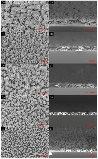 Top-view and cross-section SEM images of Ag nanohelix arrays deposited at spin rates of (a,b) 0.012 rpm, (c,d) 0.018 rpm, (e,f) 0.023 rpm, (g,h) 0.029 rpm and (i,j) 0.035 rpm.