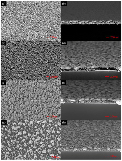 Top-view and cross-section SEM images of Ag nanohelix arrays deposited at deposition angles of (a,b) 80°; (c,d) 83°; (e,f) 86° and (g,h) 89°.