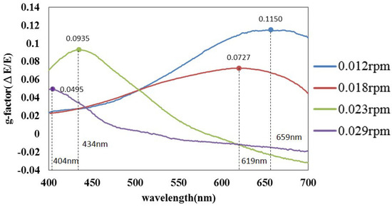 g-Factor spectra of samples deposited at 0.012 rpm, 0.018 rpm, 0.023 rpm, and 0.029 rpm.
