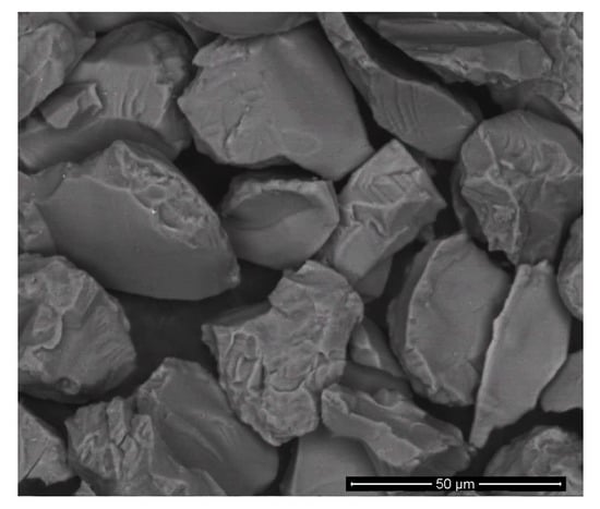 The erosion behavior of coated samples was evaluated by an air jet erosion tester TR-471-400 (DUCOM Instruments, Bangalore, India). Erosion testing was carried out as per ASTM G76 standard at room temperature [35]. Impact velocity was measured using the double disc rotating method [36]. The erosion testing parameters are given in Table 2. Alumina particles of 50 µm size were used as an erodent (Figure 1).