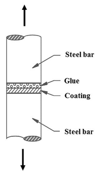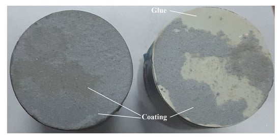 Adhesion tests were carried out following the ASTM C633 standard [37] using an Instron 5882 testing machine (Instron Corporation, Norwood, MA, USA). The experimental setup consisted of identical cylindrical rods (measuring 25.4 mm in diameter and 50 mm in height) screwed into a tensile machine on one of their tips where on another tip the thermal spray samples were glued, as seen in Figure 2. Adhesive glue with a tensile fracture strength of over 70 MPa was used.