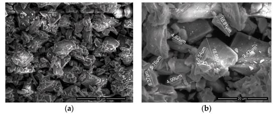 SEM micrographs of zircon powder (back-scattered electron mode). (a) ×2000; (b) ×5000.