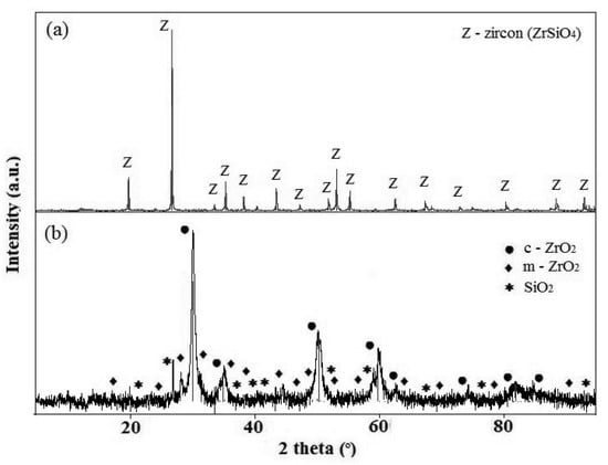 Zircon (ZrSiO4) is a natural mineral used for various applications as a refractory bulk material [1,2,3,4]. The nominal chemical composition of zircon is 67.1 wt % ZrO2 and 32.9 wt % SiO2, but there are also small amounts of Fe2O3, cerium, thorium, or hafnium [1]. Zircon is among the most widely used and cheapest spray-coating material for refractory applications [5,6,7,8,9]. Zircon decomposes into zirconia (ZrO2) and silica (SiO2) during plasma spraying, and does not recombine if cooled quickly enough [9,10,11,12,13,14,15,16]. This combination of ZrO2 and SiO2 shows a high thermal shock resistance, good corrosion resistance, etc. [1]. Zircon coatings were deposited by a plasma spray [10,17], plasma spraying with water-stabilized plasma systems [1], and atmospheric pressure plasma spraying [18]. The sprayed zircon deposits were observed with all three modifications of zirconia (c-ZrO2 [17,19], m-ZrO2 [17], and t-ZrO2 [19]) [20]. Which of these phases will prevail in the plasma-prepared material depends on the technology of its preparation [5]. Zircon is an ideal material for plasma spraying due to its low cost and the typically optimal performance of the coatings has a sufficiently wide range of process parameters [1].
