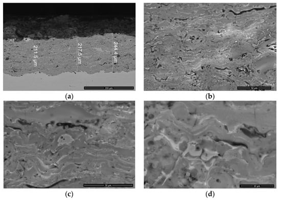 Figure 5 presents the SEM micrographs (back-scattered electron mode) of the polished cross-sections of the zircon-based coatings (210–250 μm thick). No vertical cracks were observed in the coating. As shown in Figure 5, the sample had a wavy and stratified structure with piled-up flattened particles. In the structure of the coating, the lamellar structure was poorly visible, and the boundaries of the lamellas were diffuse.