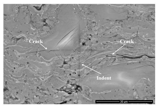 The results of fracture toughness are shown in Figure 6. The crack pattern was identified as crack type I, where dominant cracks occurred parallel to the substrate and emanated from one or two corners of the horizontal diagonal of impression [38].