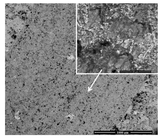 The microstructure and elemental composition of the specimens were studied by a scanning electron microscope (Quanta 200 3D, SEM, FEI Company, Eindhoven, The Netherlands) and an optical inverted microscope (Olympus GX51, Olympus Corporation, Tokyo, Japan). Porosity was determined with the metallographic method [22,23,24,29,30,31]. X-ray analysis was done using a diffractometer Rigaku Ultima IV (Rigaku Corporation, Tokyo, Japan). Crystalline phases were identified by the ICDD PDF-2 (2008) powder diffraction database [22,23,24]. Micro-hardness was determined by an automatic micro-hardness tester DM-8B (Affri, Induno Olona, Italy) with a test load of 200 g. Fracture toughness of the coatings was determined by the indentation method at a 300 g load. The fracture toughness (Kc) was evaluated using a well-established formulation by Evans and Wilshaw [32]. The tribological evaluation of the coated substrates under dry conditions was performed using a ball on a disc tribometer CSM Instrument according to ASTM wear testing standard G-99 (Table 1) [33]. All tests were performed at 25 °C with a relative humidity of approximately 50%. During testing the friction coefficient was recorded as a function of the sliding distance. A quantitative estimate of the wear resistance of specimens and the counterbody was made using the wear factor W; a method for calculating the wear factor is presented in Reference [34]. The wear factor is expressed as Equation (1):