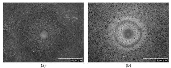 The results of the erosion resistance of the coatings are shown in Table 3. Samples were eroded with angles 30°, 60° and 90°. It was established that increasing the impact angle raised the erosive rate of the zircon-based ceramics coatings (Table 3). Erosion areas formed as elliptical shapes for 30° and 60° (Figure 8a), and as round shapes for 90° (Figure 8b). The elliptical shape was formed due to a higher flow divergence of the abrasive particles where the corners of hitting were 30° and 60° [45]. It is known that the removal of material from the surface occurs due to plastic deformation for small angles (less than 30°), and due to the formation of microdefects and subsequent ductile fractures for bigger angles (90°) [46].