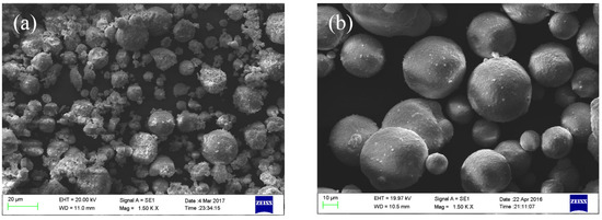 Morphologies of the 8YSZ powders. (a) Particle size ranging 15–25 µm; (b) Particle size ranging 45–60 µm.