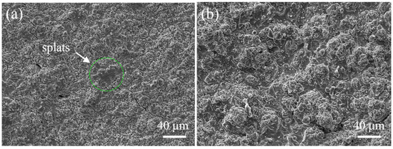 The difference in the pore orientation of the coatings deposited from the two particle size powders may relate with the difference in the stacking morphology of the splats. As can be seen from Figure 7, the surface of the coating prepared by the coarse YSZ powder (Figure 7a) is rougher than that prepared by the fine powder (Figure 7b), which can infer that the interfaces between the lamellar prepared by coarse particle size are more tortuous. The rough interface may facilitate increasing the mechanical bonding strength between the following deposited splats and the previously formed coating. Therefore, during the thermal shocks, cracks in the coating prepared by the coarse powder are difficult to expand along the lamellar interface (parallel to the substrate). Instead, some intra-splat cracks perpendicular to the substrate are formed. However, in the coatings prepared by the fine powder, due to the smooth lamellar interface, the crack propagation resistance along the interface is weak, so it tends to form inter-lamellar cracks in the direction of the parallel to the substrate.