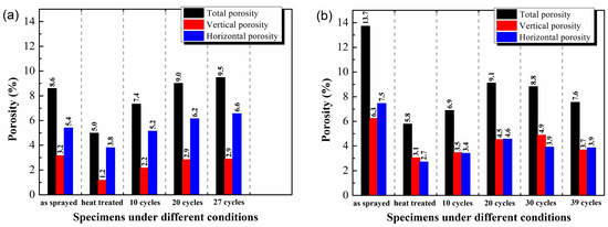 Through cyclic thermal shock test, it was found that all three samples of the coating prepared with fine YSZ powder were cracked after 27 cycles of thermal shock, while the lifetime of three samples deposited from coarse powder were 37, 37, and 39 times, respectively. The pore structure of the coating affects the thermal shock life of the thermal barrier coating. Figure 8 shows the pore structure of YSZ coatings deposited from the two different size of powder at specific thermal cycles. The pores in the coating after thermal shock contain the initial ones formed during the deposition process and the micro-cracks generated during cyclic thermal shock test. By means of the pore structure analysis method in Section 2.3, the evolution of total porosity and corresponding percentages of horizontal and vertical pores in coatings prepared by different YSZ powder are obtained (shown in Figure 9). It can be seen that the porosity of the two kinds of YSZ coatings declines after heat treatment and then increases with the number of thermal shock cycles increasing. The decrease of porosity after heat treatment is due to sintering at high temperature, and the increase of porosity resulted from the formation of micro-cracks under thermal stress during thermal shock. Due to the large number of inter-lamellar cracks in the coating prepared by the fine YSZ powder, the total porosity of the coating after thermal shock is slightly higher than that deposited from coarse YSZ.