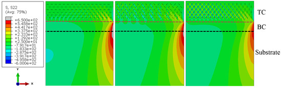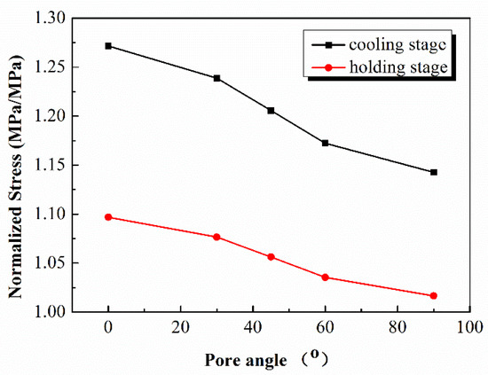 The influence of the orientation of pores in the TC layer on the thermal stress is shown in Figure 13. As the pore orientation changes from horizontal to vertical, the maximum stress at the BC/substrate interface shows a decreasing trend during both the insulation stage and the quenching process. In addition, though the pore angles are different, the stress distributions in the coating are similar. However, the area of the high stress region near the BC/substrate interface of the coating is gradually reduced. The presence of vertical pores can improve the strain tolerance of the coating and reduce the stress caused by the thermal expansion mismatch between the metallic and the ceramic layer. Fracture toughness is an important factor affecting the thermal shock performance of TBCs. In this study, the fracture toughness of the ceramic coatings prepared by the two kinds of powders may be different, which can be inferred from the difference in micro-cracks of the two kinds of coatings after thermal shocks. However, it should be noted that the fracture of all the samples in this experiment occurs in the bond coat near the BC/substrate interface, and the BC layers of the two coatings are the same and undergo the same heat treatment. Therefore, the difference of the thermal shock life between the two coatings is mainly due to the different stress state of the coating system which is related to the pore structures. The toughness of the ceramic layer may affect the pore structure of the coatings, thereby affecting the stress in the TBC system. Therefore, it can be inferred that the coatings prepared by coarse YSZ powders suffer less thermal stress due to the presence of vertical pores, thus, having better thermal shock resistance.