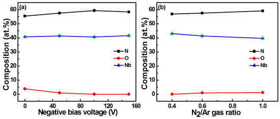 Elemental compositions of NbN coatings deposited under different bias voltages with constant 0.6 ratio of N2/Ar (a); and under different N2/Ar gas ratios with constant −50 V bias voltage (b).