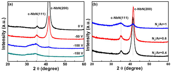 Figure 1 plots the elemental composition of the NbN coatings as a function of substrate bias and N2/Ar gas ratio measured by EPMA. A relative low oxygen (O) content, i.e., 3 at.%, in all coatings was possibly derived from the residual gas in the vacuum chamber and/or the Nb target that was fabricated by self-propagating high-temperature synthesis. As the bias voltages increased from 0 V to −100 V (Figure 1a), the N content slightly increased from 55.4 at.% to 59.4 at.%, then rebounded to 58.4 at.% at −150 V bias voltage, while the Nb content was almost constant value at around 41 at.%. As to Figure 1b, with increasing N2/Ar gas ratio, the N content also slightly increased. The adequate N reacted with Nb atoms and the superfluous N atoms could squash into the interstitial positions of NbN structure, which finally reached to a saturated value. It was considered that the relatively high N2/Ar gas ratio (over 0.3) leads to the formation of coatings with over N content, which was also found by Benkahoul et al. and Jun et al. [11,24]. The NbNx>1 coatings sputtered under these conditions are all over stoichiometric x = N/Nb > 1. Nitriding is another factor that needs to be considered. In the rotation of the substrate (the substrate does not face the sputtered Nb target for most of rotation time) and/or at a small duty cycle (the time during pulse-off is long compared with the pulse-on time), the coating is additionally nitrided and this results in no dependence of N content on bias voltage and N2/Ar ratio.