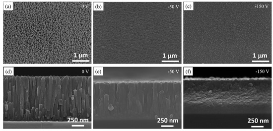 Surface (a–c) and cross-sectional images (d–f) of NbNx>1 coatings deposited under different bias voltages with constant 0.6 ratio of N2/Ar.