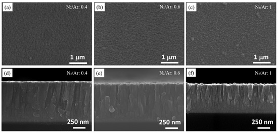 where k is Boltzmann constant, T is Kelvin degree, σ is the effective diameter of molecule or ion, and p is the pressure in the chamber. It is known that the N2 gas has a larger molecular diameter is than Ar gas and the mean free path becomes smaller with increase of N2 gas partial pressure. It may suffer from much collisions and the injection energy to the surface of coatings will become lower. Thus, it will decrease bombardment effects of the injected particles and will cause poor surface diffusion, resulting in coarse surface compared to lower N2 partial pressure. Another explanation on the variation of roughness: as shown in Figure 4a, the surface of coatings was much smoother than the surface of high N2/Ar ratio coating. Figure 4d–f shows that the columnar structure was very compact and dense in N2/Ar ratio of 0.4, whereas, with increasing values of N2/Ar ratio, the columnar structure became coarser and looser, which were contributed to the enhancement of surface roughness.