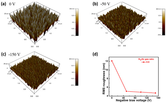 The three-dimensional topographic AFM images of the typical NbNx>1 samples (a–c), and Root Mean Square (RMS) roughness deposited under different bias voltages with constant 0.6 ratio of N2/Ar (d).