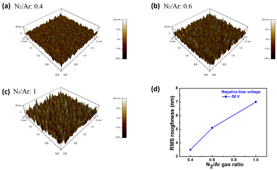 The three-dimensional topographic AFM images of the typical NbNx>1 samples (a–c), and Root Mean Square (RMS) roughness deposited at different N2/Ar gas ratios with constant −50 V bias voltage (d).