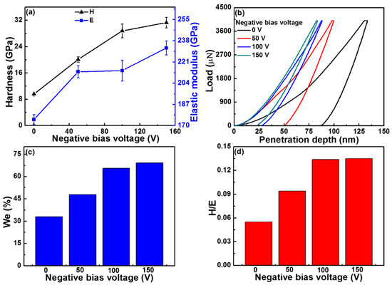 Hardness (H) and elastic modulus (E) (a); load-displacement curves (b); elastic recovery (We) (c); and H/E value of NbNx>1 coatings deposited under different bias voltages with constant 0.6 ratio of N2/Ar (d).
