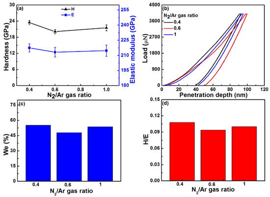 Hardness (H) and elastic modulus (E) (a); load-displacement curves (b); elastic recovery (We) (c) and H/E value of NbNx>1 coatings deposited at different N2/Ar gas ratios with constant −50 V bias voltage (d).