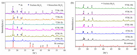The XRD patterns of Bi and Bi2O3 coatings prepared at different oxidation temperature or time are displayed in Figure 1. The characteristic diffraction peaks of the as-prepared Bi coatings can be indexed to hexagonal Bi consistent with PDF card No. 44-1246. After thermal oxidation above 673 K, the Bi coatings all transformed to Bi2O3 coatings even though the oxidation was only maintained for 2 h. When the Bi coatings were oxidized at 673 and 773 K for 2 h, monoclinic Bi2O3 coatings were prepared. With the time extending to 5 and 10 h, the as-prepared Bi2O3 coatings not only consisted of monoclinic Bi2O3 phase (labeled by hollow square, PDF card No. 41-1449) but also triclinic Bi2O3 phase (labeled by circle, PDF card No. 50-1088). Nevertheless, for the coatings oxidized at 873 and 973 K, mixed-phase Bi2O3 were always obtained with the oxidation time ranging from 2 to 10 h. Additionally, the diffraction peaks from triclinic Bi2O3 became stronger with the temperature or time raising. Consequently, the coatings composition evolved from single phase to mixed phases with prolonged time at lower temperature or heightened temperature. Moreover, almost all the diffraction peaks of the samples shifted to smaller angel with the oxidation time prolonged, which may result from stress release that accumulated during the ball milling process.
