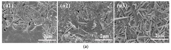 The surface morphologies of Bi2O3 coatings: (a1) BC-673-2; (a2) BC-673-5; (a3) BC-673-10; (b1) BC-773-2; (b2) BC-773-5; (b3) BC-773-10; (c1) BC-873-2; (c2) BC-873-5; (c3) BC-873-10; (d1) BC-973-2; (d2) BC-973-5; (d3) BC-973-10.