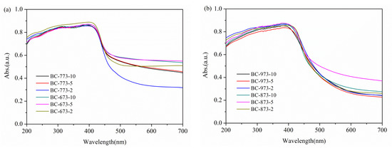 UV-Vis diffuse reflectance spectra of the as-prepared coatings: (a) BC-673-2, BC-673-5, BC-673-10, BC-773-2, BC-773-5, BC-773-10; (b) BC-873-2, BC-873-5, BC-873-10, BC-973-2, BC-973-5, BC-973-10.