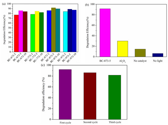 The degradation efficiencies of MG solution over the series of Bi2O3 photocatalyst coatings: (a) after irradiating for 180 min; (b) control experiment results; and (c) the reusability of BC-873-5.