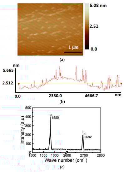 Figure 2a shows an atomic force microscopy (AFM) image of the deposited graphene film. A large uniform graphene film was formed on the substrate, on which some newly generated slices were scattered. From the scale picture in Figure 2b, we can estimate that the thickness of the yellow uniform graphene is approximately 2.5 nm, equaling a few layers of graphene, the highest height of the film is about 5.66 nm. Figure 1c shows the Raman spectrum of the deposited graphene film. We can see that two major scattering peaks appear in the spectrum, a 2D-band peak at 2692 cm−1 and a G-band peak at 1580 cm−1. The intensity ratio of IG:I2D = 2 confirms that this is a few-layer graphene [].